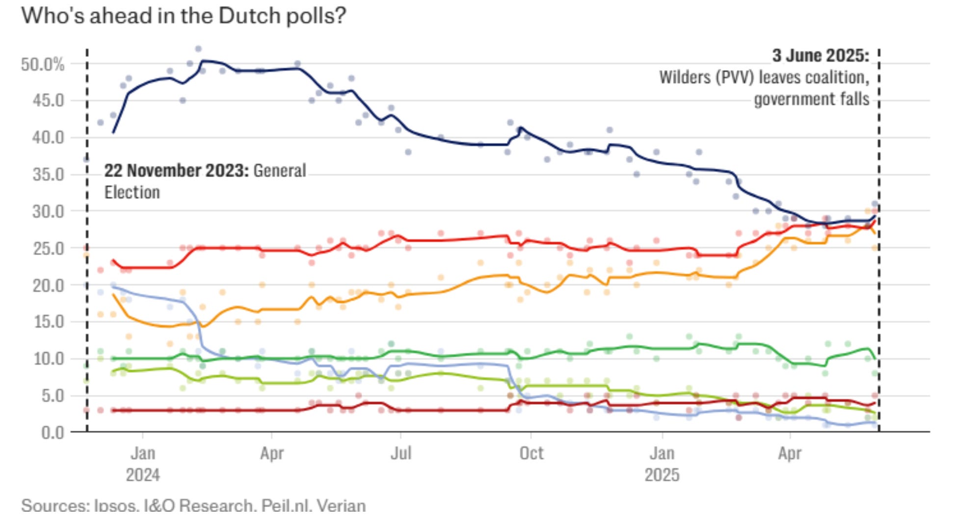 The collapse has left the Netherlands in limbo. Prime Minister Dick Schoof has resigned and will now serve in a caretaker capacity. Polling suggests that the PVV has lost the commanding lead it once held, and while Wilders still speaks optimistically of returning as prime minister, it is difficult (although not impossible) to see a path back to power. Most of his potential allies have declared they will not work with him again. As one coalition partner, Caroline Van der Plas (BBB) put it, this was “a kamikaze act” – reckless and self-defeating.