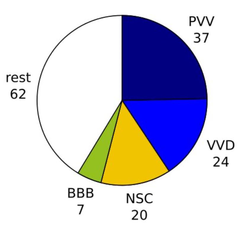 Dutch Parliament breakdown, with Wilders’ PVV taking the greatest share of seats.