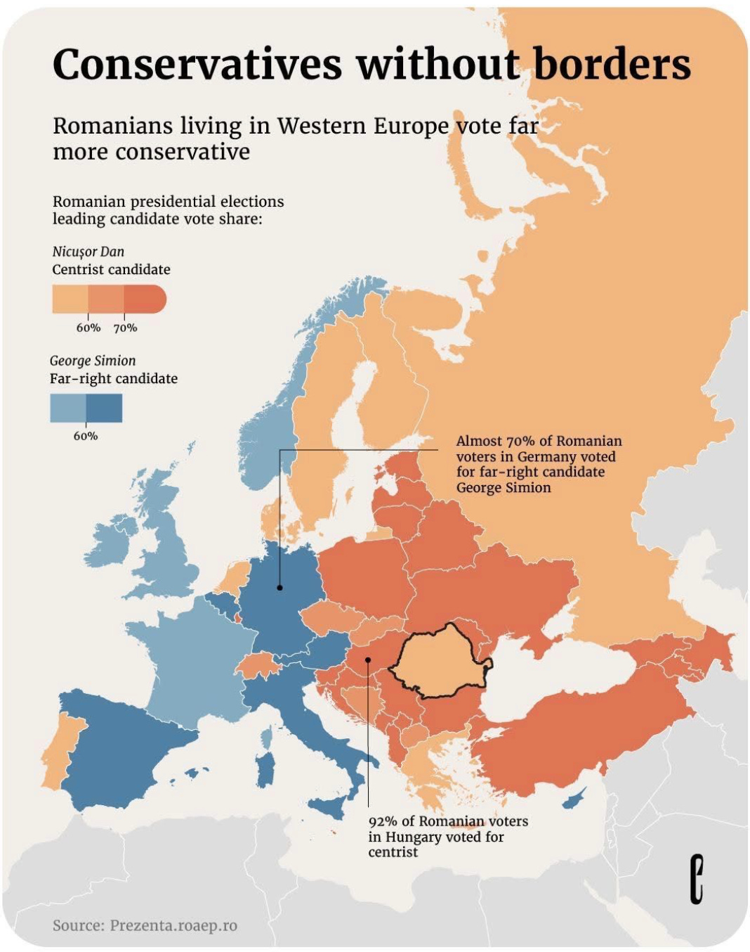 But in the second round vote last Sunday, Dan ultimately emerged victorious with 54% of the vote to Simion’s 46%. His recovery from a 20-point deficit to an 8-point win suggests that he won over most voters who had not backed Mr Simion in the first round, and the gap closed further after a televised debate which Mr Dan was widely agreed to have won. The turnout was a record high. The country’s large diaspora, with more than 4m citizens living abroad (compared with 19m inside the country), turned out in huge numbers. And unlike in the first round, they did not break as heavily for Mr Simion overall, although conspicuously those in Western Europe lent more strongly in the populist’s direction – something anecdotally attributed to their disillusionment at the effects of progressivism and mass immigration on countries like Britain, Germany and France, and an aversion to seeing the same happen back home.