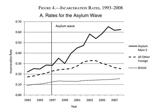 As for asylum seekers, whose numbers have exploded in recent years amidst a surge in small-boat crossings of the English Channel, data is harder to come by, but a 2013 study found that they commit crimes at four times the rate of the general British population: