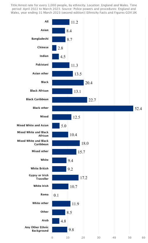 When it comes to arrests, the Office for National Statistics (ONS) provides a detailed ethnic breakdown. The White British arrest rate as of 2023 is 9.2 per 1,000. This means that 11 out of 19 ethnic groups have higher arrest rates than the native population. By comparison, the largest Muslim group, Pakistanis have an arrest rate of 11.3, while other Asians excluding Bangladeshis have an arrest rate of 13.5. The Black population meanwhile has an arrest rate of 20.4 per 1,000, which is more than twice the White British rate.