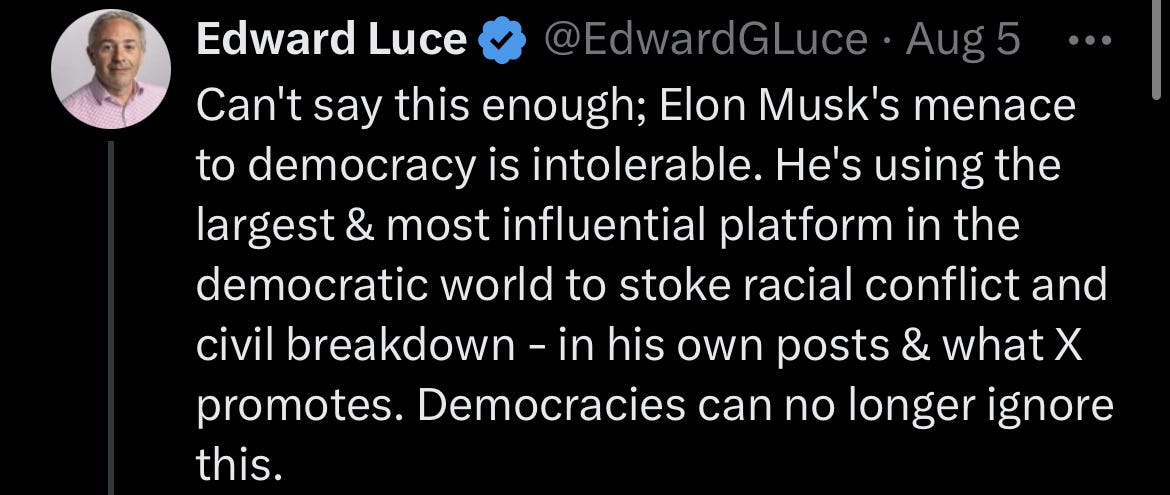 A few weeks ago I had a Twitter-spat with Edward Luce. Luce is a British journalist and chief US commentator for the Financial Times. I reacted to Luce when he blamed the recent race riots in Britain, which broke out in response to three young girls being stabbed to death by the son of Rwandan refugees, on Elon Musk. Musk had taken to Twitter to criticize the British government’s two-tier policing and threats of censorship in response to the disorder, which, according to Luce, made him the real “menace to democracy”: