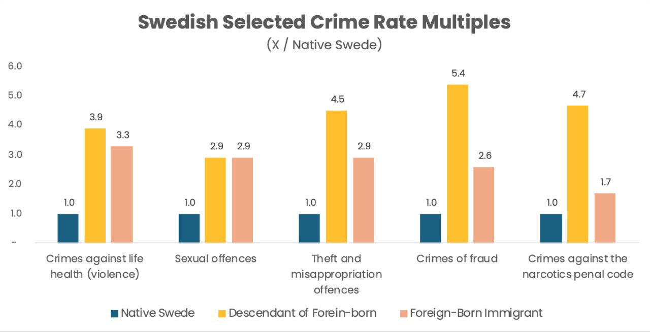 A similar picture emerges in Sweden, which accepted the highest proportion of non-Western refugees and immigrants in Europe during the 2015 migrant crisis. In 2021, the Swedish National Council for Crime Prevention found that foreign-born immigrants were suspects of crimes against life health (i.e. violence) at 3.3 times the rate of native Swedes. They were also suspects of crimes of sexual offenses at 2.9 times the native rate. The multiples are even worse for their descendants, who were suspects of violent crime at 3.9 times the native Swedish rate, and of sexual offenses at a multiple of 2.9. The multiples for other offenses involving theft, fraud, and narcotics are bigger still, as you can see below: