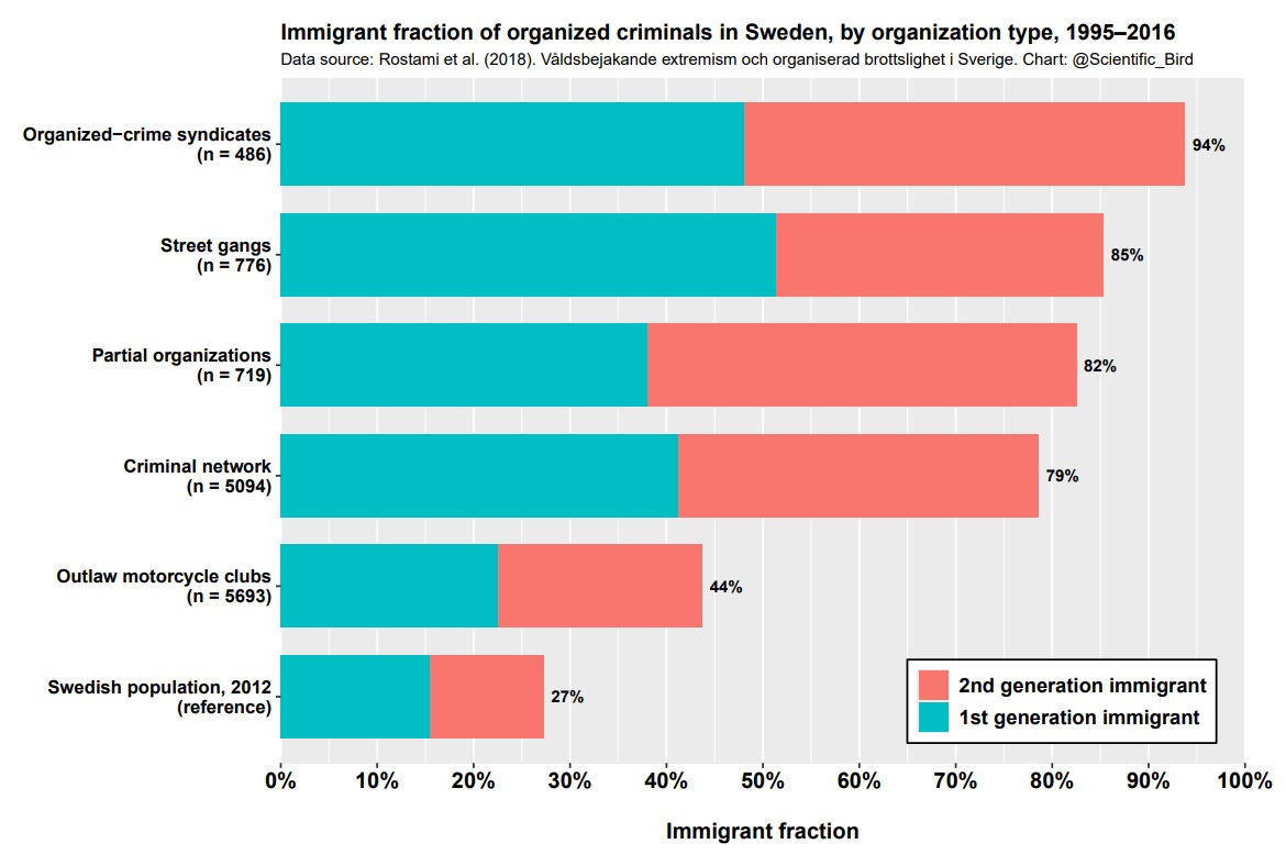 The rise of serious crime in Sweden is principally related to the growth in organized crime. About 8 in 10 firearm-related homicides are directly tied to such criminal outfits. A recent study found that as many as 85% of street gang members and 94% of organized-crime syndicates have a first- or second-generation immigration background, as you can see below: