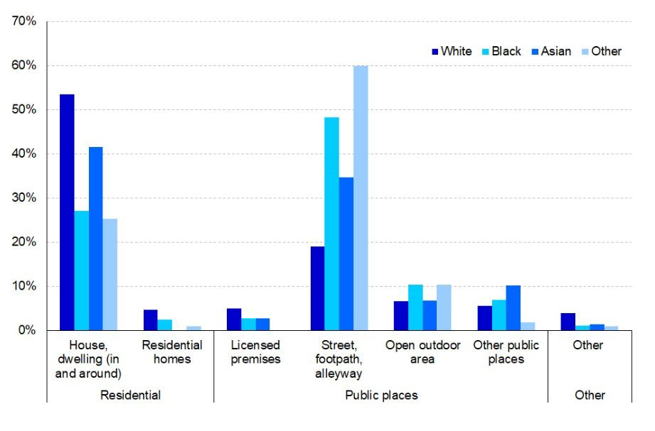 It is also worth noting that killings perpetrated by non-White British groups are more likely to occur in the street, whereas homicides perpetrated by Whites are more often committed in domestic settings. This means that migrant homicides are perceived—accurately—as having made Britain’s public sphere less safe, a phenomenon most vividly evident in a spree of urban stabbings: