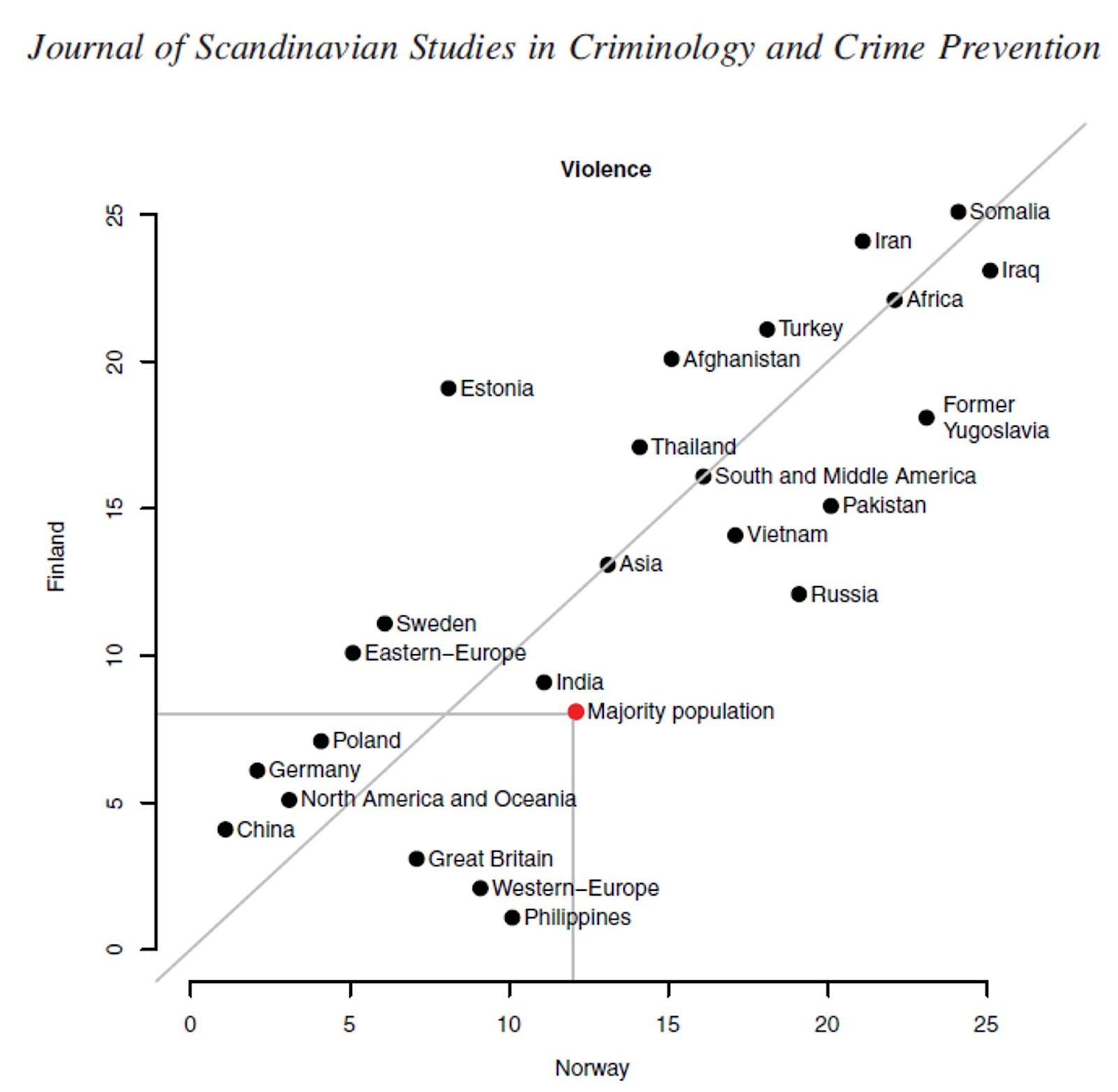 A study into crime rates in Finland and Norway found a similar correlation, with migrants from Africa and Middle Eastern countries committing crimes at a significantly higher rate than native, Western, and some Asian populations, as you can see in the graph below. A Finnish study from 2021 also found that, in 2020, first-generation migrants accounted for 37.5% of rapes and 17.8% of child abusers despite constituting only 7% of their population.