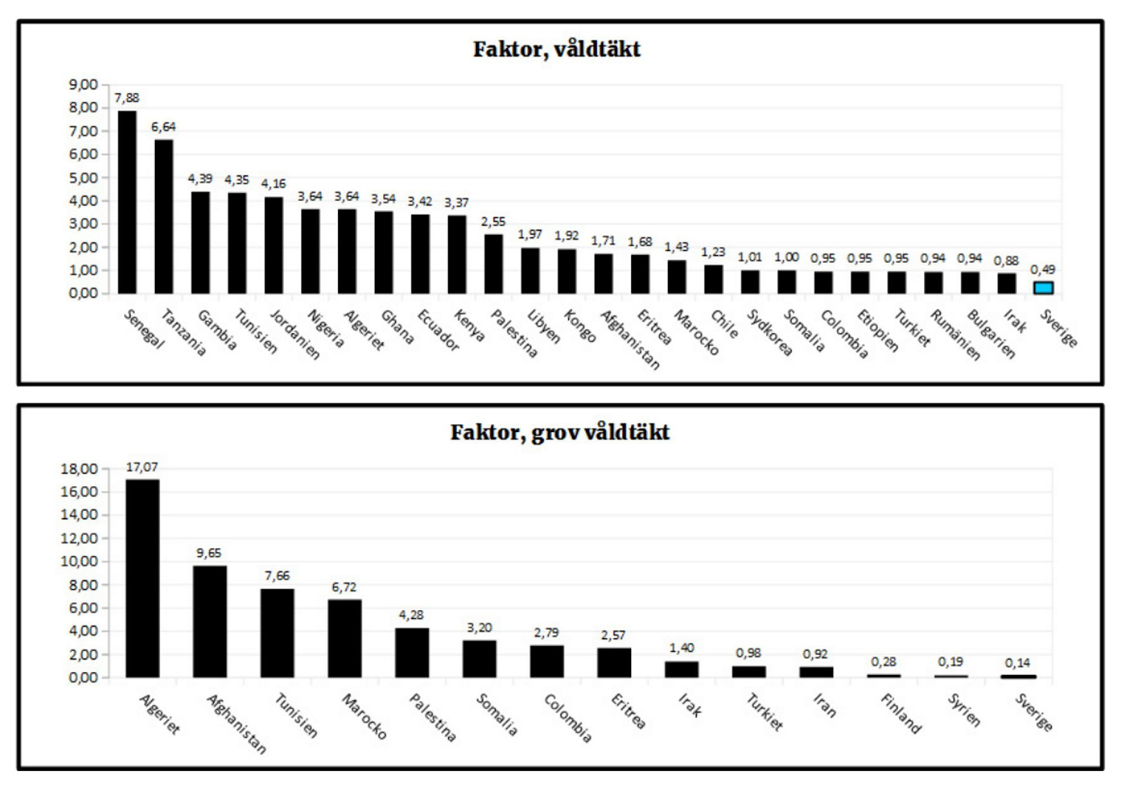 Sweden has also experienced a rape epidemic since 2015. However, a study found that even prior to the migrant crisis of that year, 60% of rapists were of an immigrant background, with half being born outside of Sweden. As the charts below demonstrate, African-originated immigrants are much more likely to commit rape (top chart) than native Swedes. MENAPT migrants, by contrast, are more likely to commit “assault rape” (bottom chart). Overall, men of non-European origin commit 84% of assault rapes despite making up only around 10% of the population: