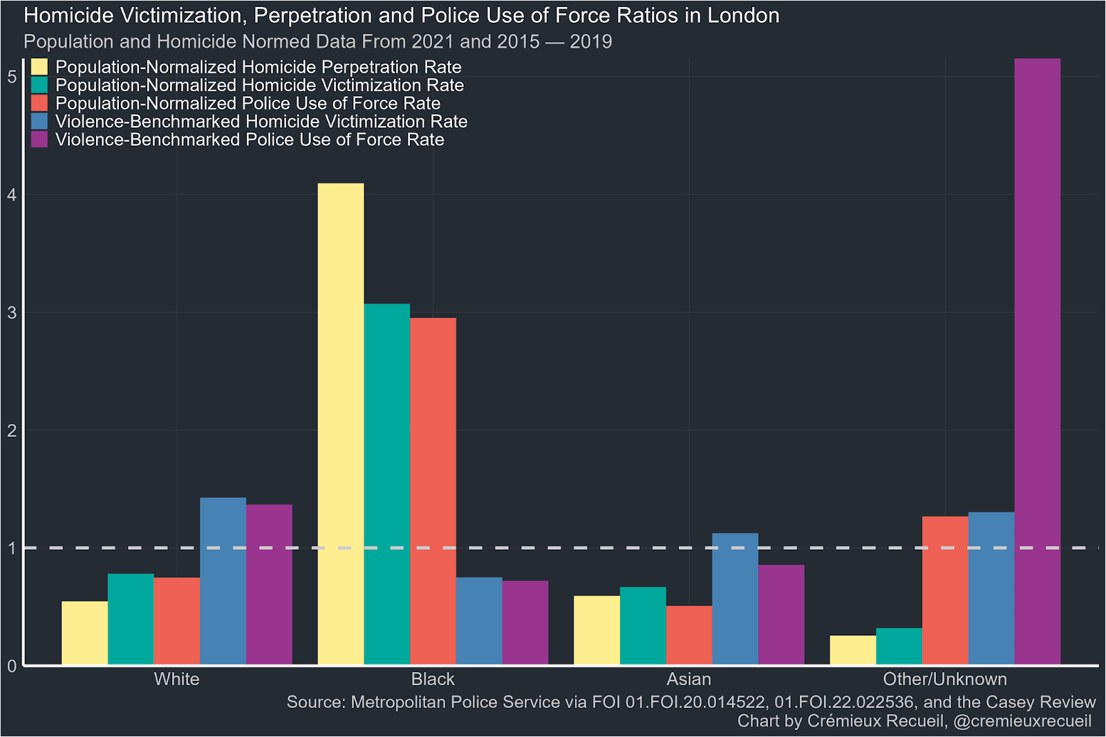 It is sometimes claimed that we cannot rely on arrest data regarding ethnic disparities because they reflect systemic racism in the police. The Economist chimed in with a response to Elon Musk in this vein: “The claim that the criminal justice system is generally biased against white people is baseless. It is black Britons, not white ones, who are most likely to be victims of discriminatory policing: in 2021 to 2022 they were 2.4 times more likely to be arrested than white people and 3.5 times more likely to be victims of police violence”. But as has been pointed out elsewhere, this inference is based on “population norming”. If we norm by homicide perpetration instead, we see that Black people in the UK are relatively under-policed compared to their share of those who commit the most serious offenses. Meanwhile, the police overuse force on whites and people of unknown racial backgrounds, as you can see from the purple bars below: