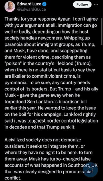 Luce fired back with a long tweet that encapsulates the reckless immigration errors of ostrich-policy neoliberal elites in the Anglosphere—the “far center” as I think of them. So I’ve decided to respond to some of them here. Here’s his reply in full: