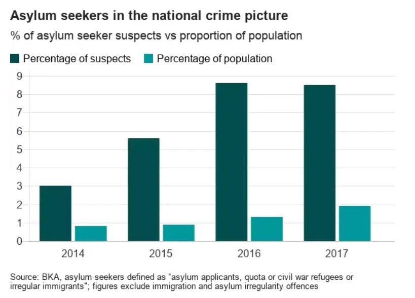 With respect to asylum seekers in Germany in particular, data from the BBC revealed that, as of 2017, they constituted 2% of the population yet accounted for 10.4% of murder suspects and 11.9% of those suspected of sexual offenses: