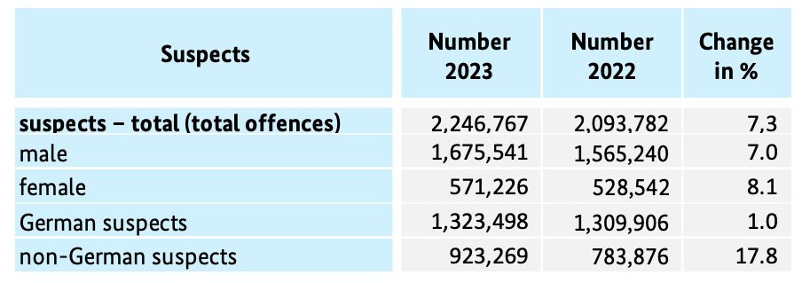 Germany is also finding out the price of high levels of immigration from the world’s most dangerous places. Data from the German police for 2023 shows that despite constituting 18.4% of the population, non-citizens account for 41.1% of all criminal suspects, as you can see in the table below. For many of the most serious violent offences, the proportion was even higher: they were the suspects in 43.1% of murders, 74.5% of robberies including murder, 44.4% of manslaughter cases, 46% of aggravated rapes, 59.5% of forced prostitution, and 66.7% of serious bank robberies. Moreover, these figures do not even include those migrants who have gained German citizenship or those of migrant heritage. If you were to separate them out from the native German figure, given that (like Sweden and Denmark) the country has a major issue with generational crime among immigrant populations from MENAPT countries in particular, the disproportionate rate of migrant crime would be even more striking.