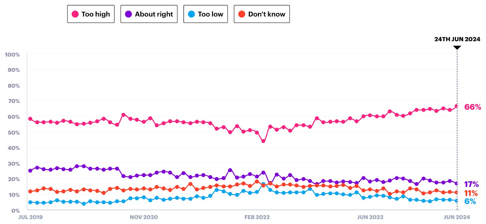 This fact pertains especially to the role of mass immigration in driving unrest. According to YouGov, 66% of Brits believe that the current rate of immigration is too high. As you can see below, this attitude is longstanding: