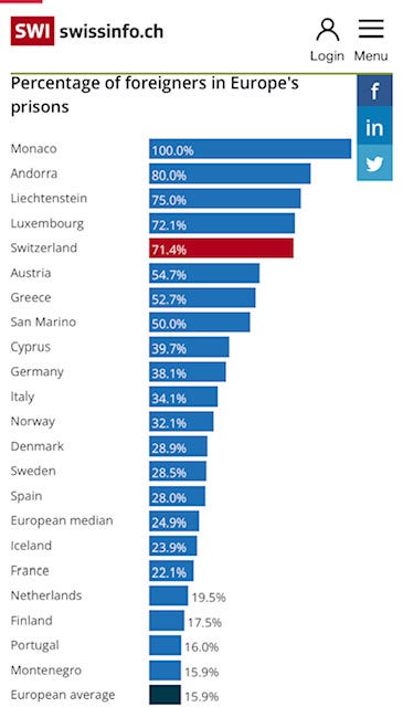 The same is true elsewhere in Europe. In most countries, first-generation migrants are overrepresented in the prison population compared to their population share: