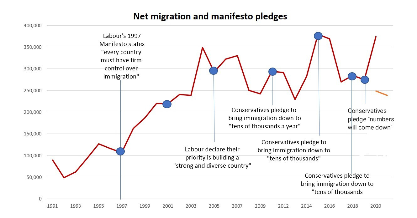 Just how serially fraudulent British politicians have been on this issue in recent decades is evident in the chart below, which shows the mismatch between the manifesto promises on which they were elected and what they have actually done instead. If it were brought entirely up to date, you’d see the level of net immigration double at the end of the series to almost 800,000 in 2022, despite repeated Tory promises to cut it to the “tens of thousands”: