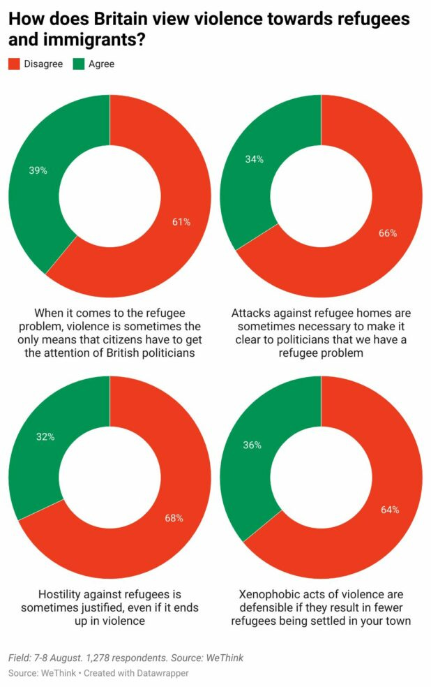 Most disturbingly, a survey conducted by polling firm WeThink has detected an apparent breakdown of public trust in democratic institutions to address the demands of the public and an increasing willingness to back violent alternatives. The poll, which was conducted on August 7–8 during the height of the recent disturbances, found that 39% of respondents agreed that “violence is sometimes the only means that citizens have to get the attention of British politicians” regarding refugees. 34% felt attacks on refugee accommodations are “sometimes necessary to make it clear to politicians that we have a refugee problem”, and that 36% felt that “xenophobic acts of violence are defensible if they result in fewer refugees being settled in your town”. Overall, 54% of those surveyed felt that the immigration policies from Westminster were the main cause of the riots. The results are displayed below: